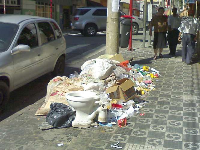 A região Sudeste é a que mais gera lixo. São 89 mil toneladas por dia - uma média de 1,2 quilo por habitante. Na cidade de São Paulo, a maior do Brasil, há ruas e calçadas transformadas em lixões. No centro da cidade, sem a menor cerimônia, eles vêm e jogam de tudo. Depois, vem a prefeitura e limpa. Ao todo, são 13 toneladas de restos de móveis, tábuas, pneus.