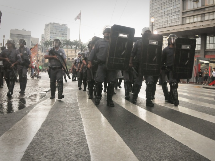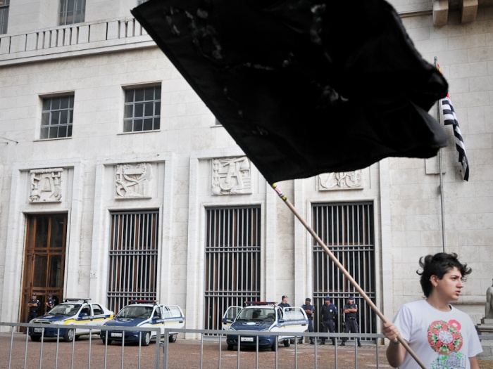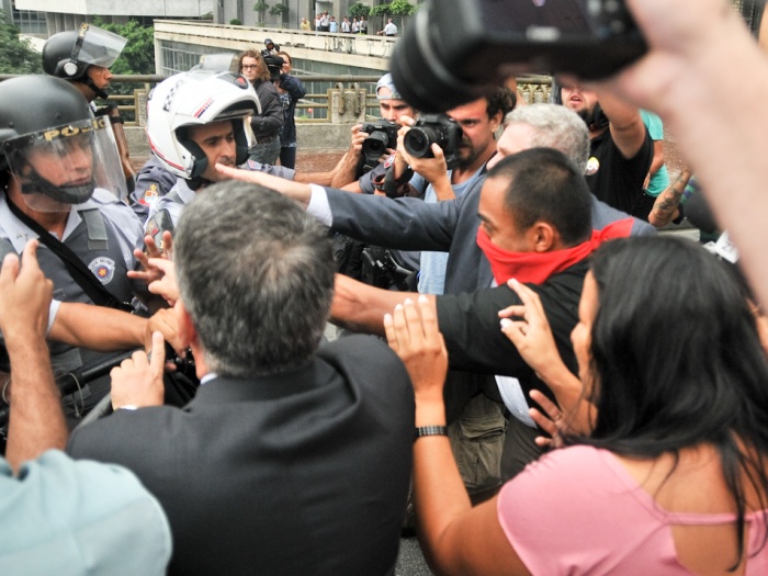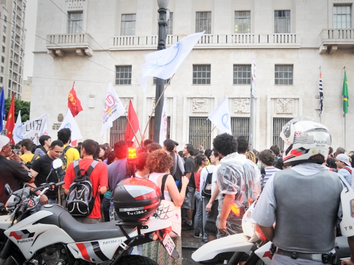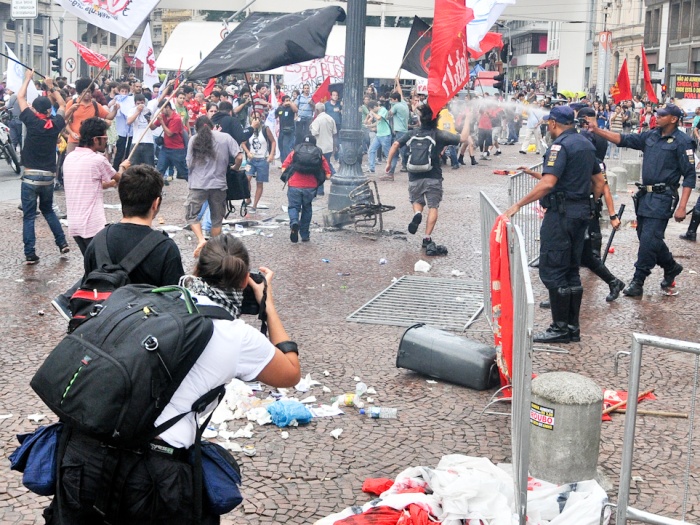 Policiais militares e agentes da Guarda Civil Metropolitana entraram em confronto com estudantes que faziam um protesto contra o aumento da passagem de ônibus para R$ 3,00 e agrediram jornalistas e vereadores que acompanhavam o ato. A confusão começou depois que os manifestantes tentaram derrubar as grades que isolavam a entrada da Câmara dos Vereadores, no centro de São Paulo.