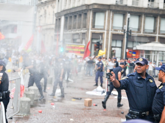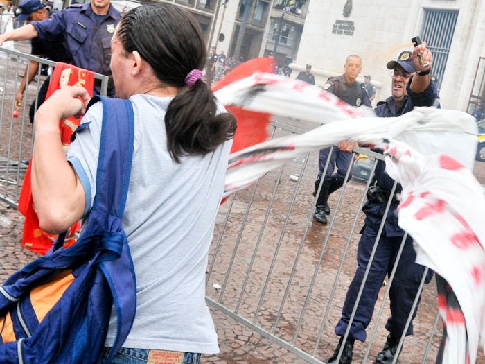 Os manifestantes atiraram pequenos objetos e bexigas com água na direção da PM. Os policiais reprimiram o ato com bombas de gás lacrimogênio. Os estudantes e fotográfos que faziam a cobertura do protesto - entre eles, Julia Chequer, do R7 - foram agredidos com cacetete e spray de pimenta.